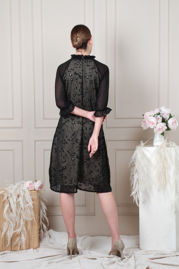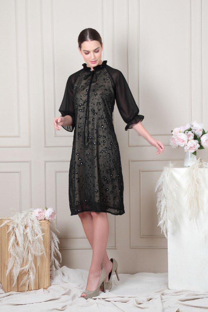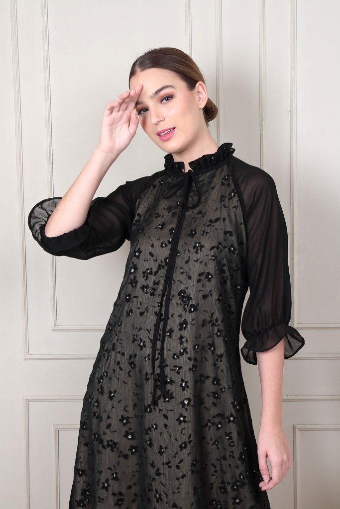 Loose cutting dress with ruffle neck line detail and puff sleeves. Made in premium Chiffon with suede texture and lil bit glitter.