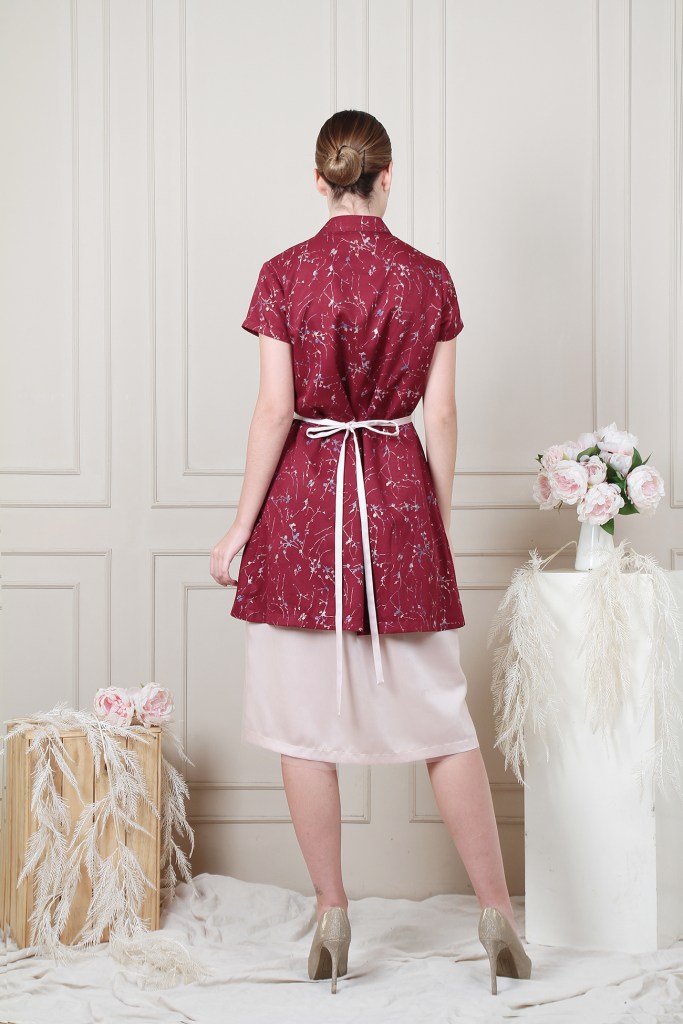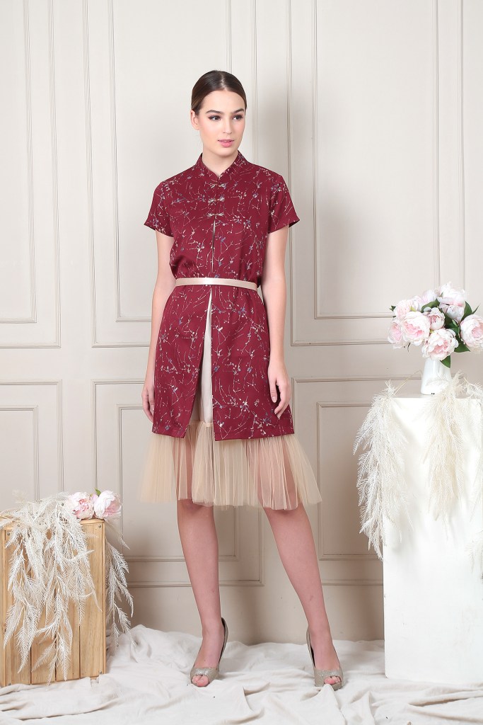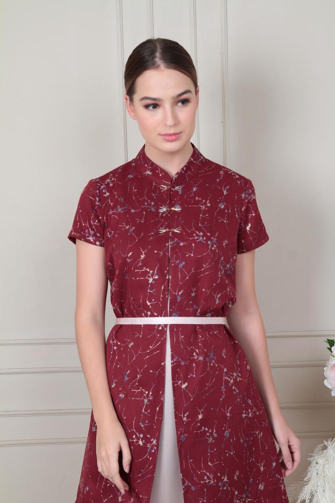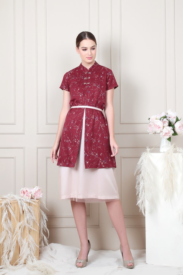 Shanghai collar outer dress with beaded shanghai button. Comfortable one with formal design. Complete with belt. Available in gold inner too.